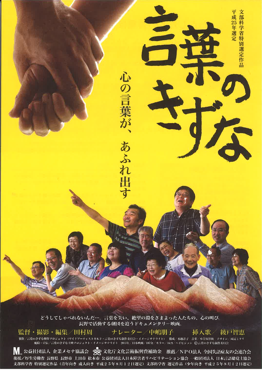 上岡代表と同じ失語症や構音障害で悩む当事者とその家族を追ったドキュメンタリー映画「言葉のきずな」。来年1月12日(祝・月)に、横浜市戸塚の男女共同参画センター横浜(フォーラム)で上映されるそうです。お近く方は是非足をお運 … [Read more…]